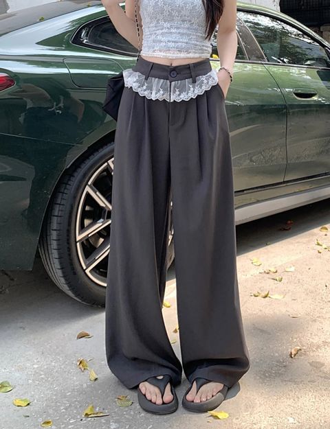 TH4314 零束缚感高低腰两穿软糯阔脚裤| 小众假两件腰头设计【小骑士刺绣】舒服到不想脱下的裤子